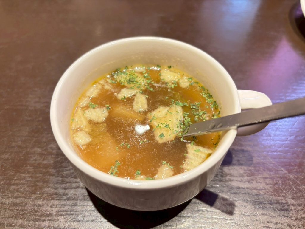 スープ自体は普通のオニオンスープという感じですが、ポテチが入ってることで少し塩味が加わり、いい感じになっていました。