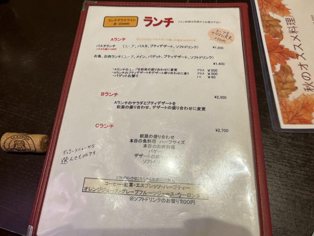お店の名前に「牡蠣と肉が旨い」とあるので、ランチにも牡蠣があるのかと思いきや、ランチメニューは「パスタ」や「魚料理」、「肉料理」がメインとなっているようです。